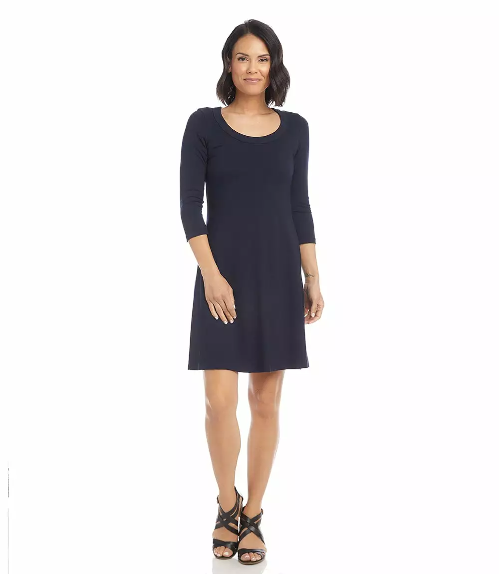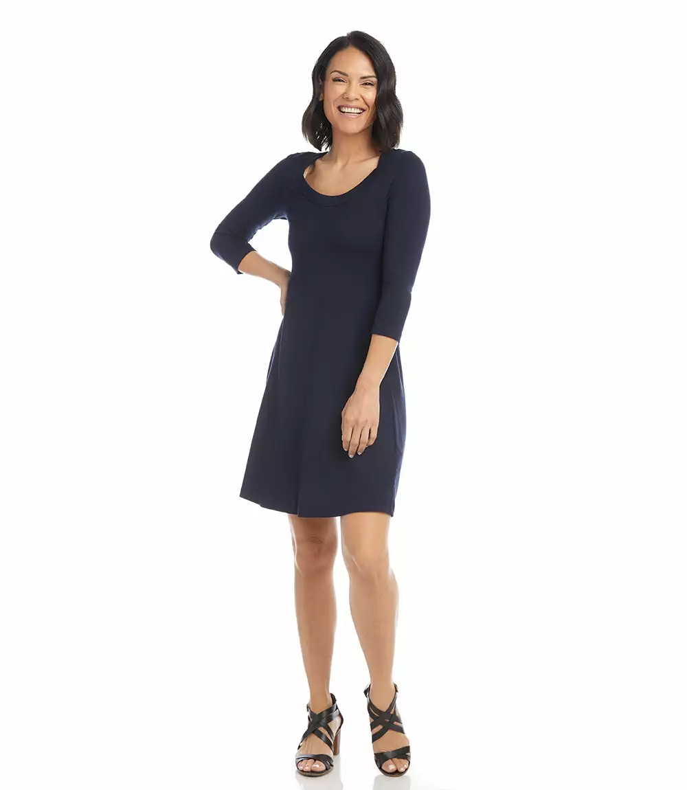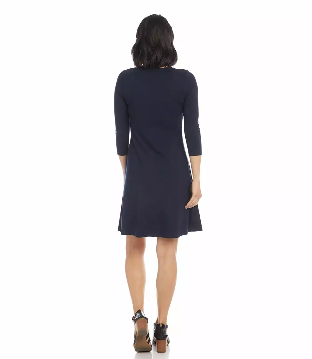 With a classic A-line silhouette, this 3/4 sleeve dress offers just enough flare to flatter any figure. Clean lines and solid colors complete the look with streamlined sophistication. Dress it up or dress it down, there is no denying that this is a must-have wardrobe essential that will continue to surprise you with its endless versatility.