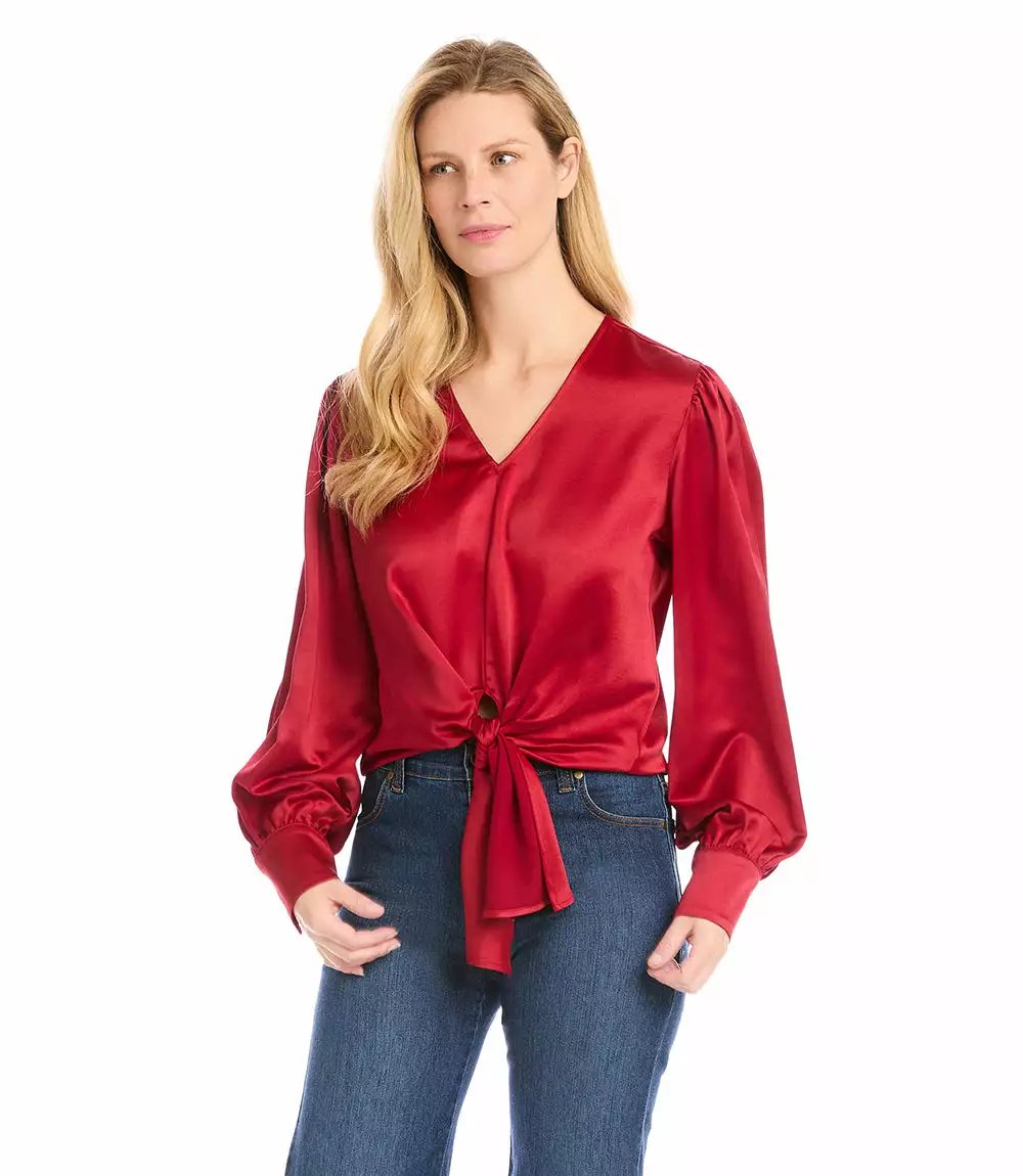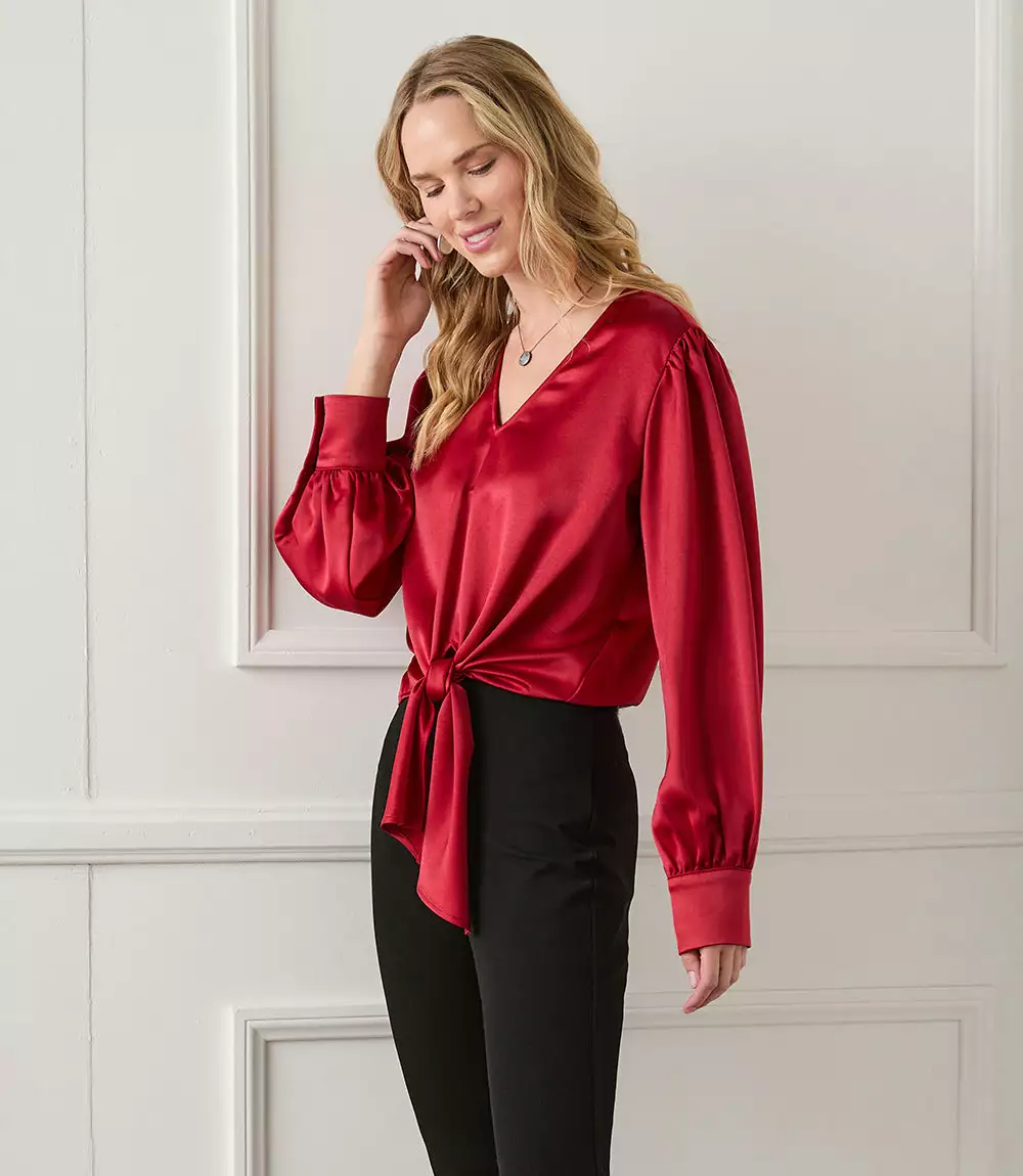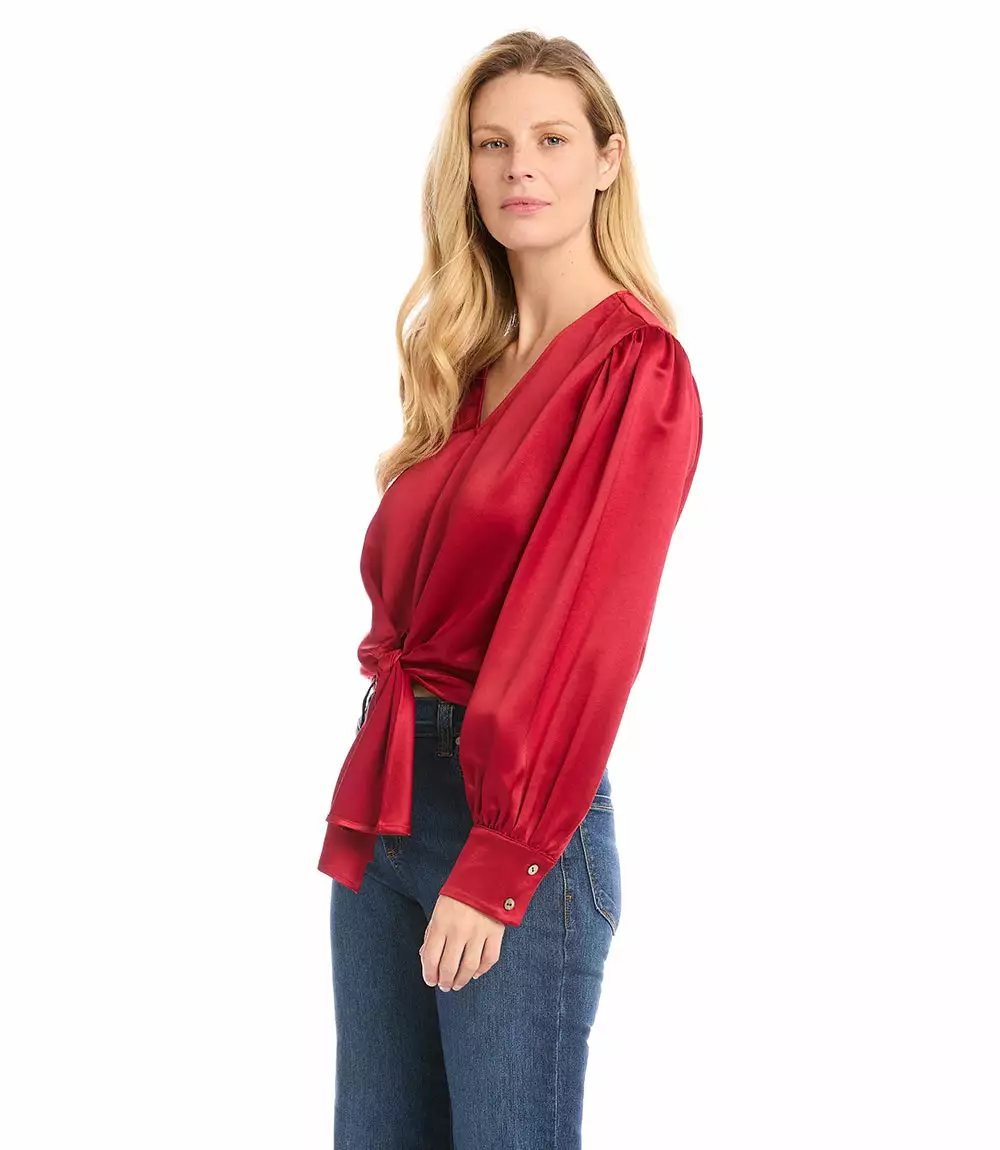 Cut from luxurious vintage heavy satin, this top is detailed with a stylish tie-front and polished cuffed sleeves. This top pairs perfectly with high-waisted jeans.