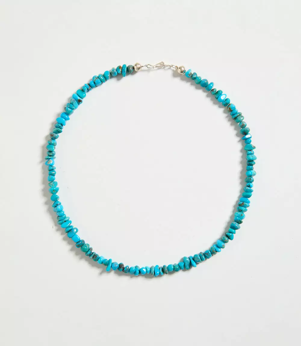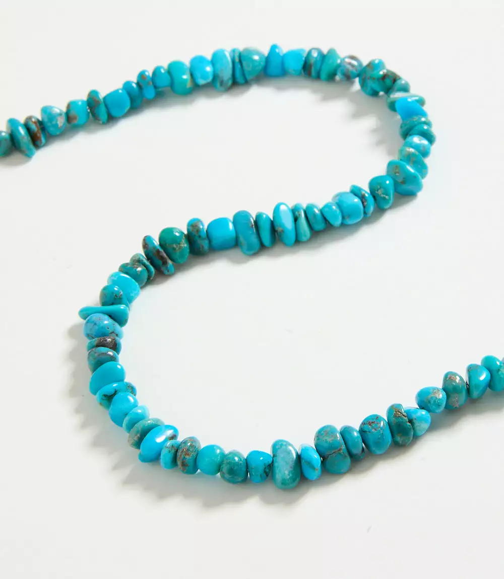 Handcrafted by Native American artisans, this stunning necklace is made of a single strand of turquoise stones and is finished with a sterling silver hook and eye closure.