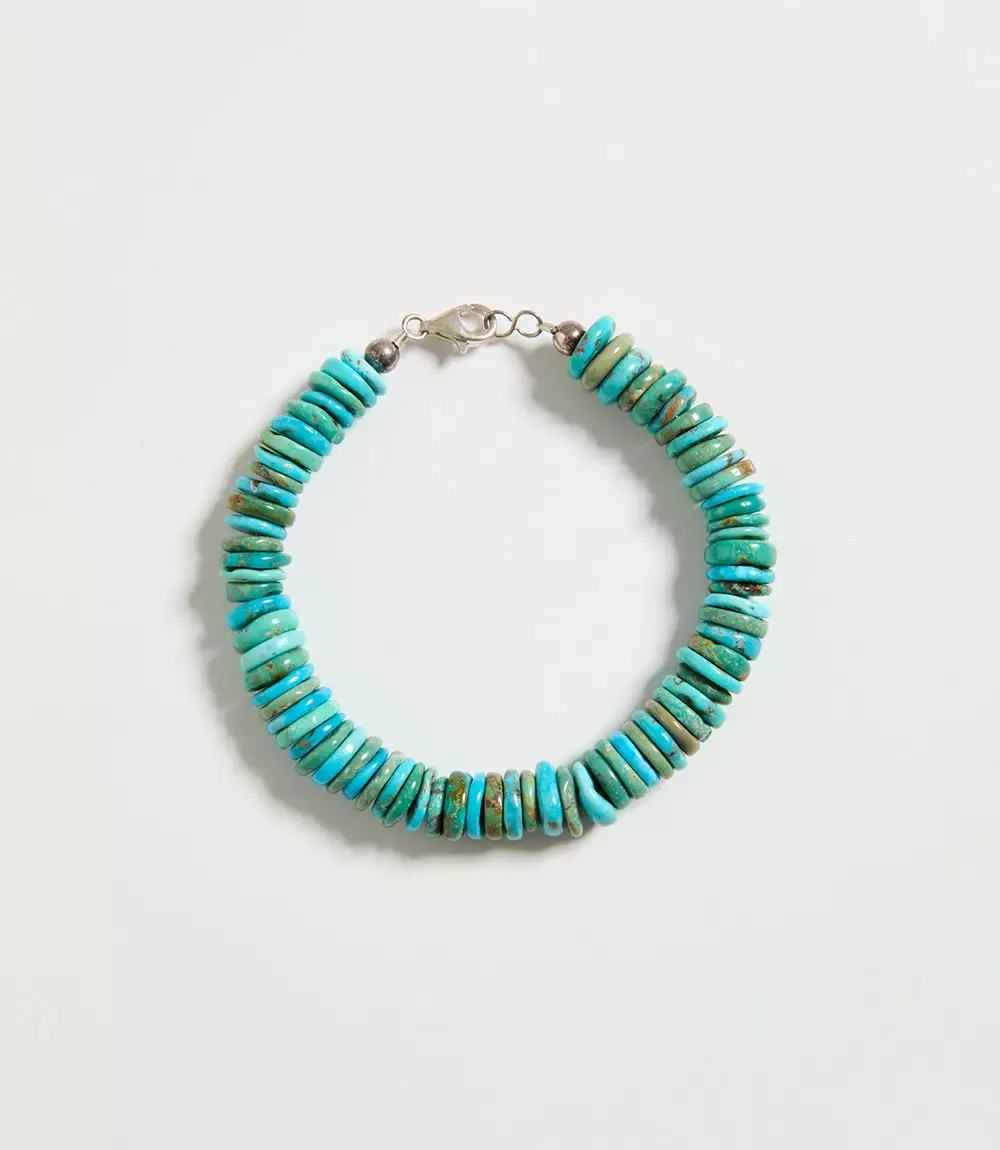 Handcrafted by Native American artisans, this beautifully made bracelet is made of chunky turquoise stones with hints of earthy tones.