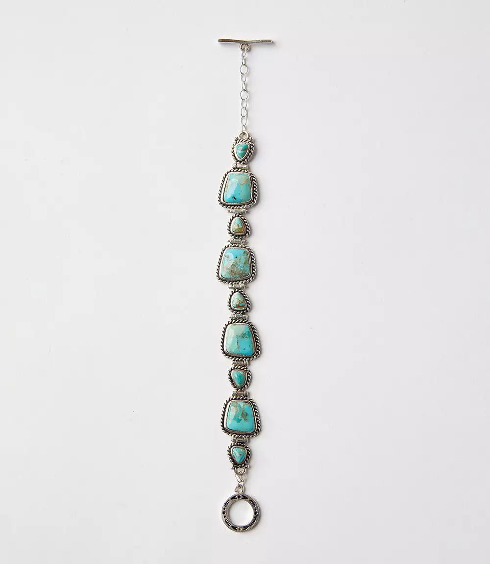 Handcrafted by artisans, this stunning bracelet is made of turquoise stones encased in sterling silver with a twisted wire rope.