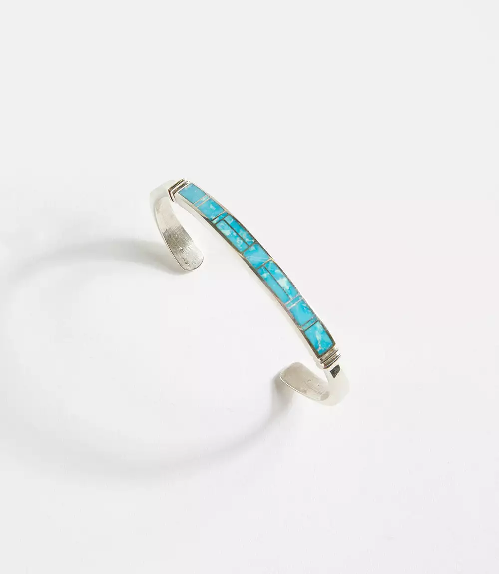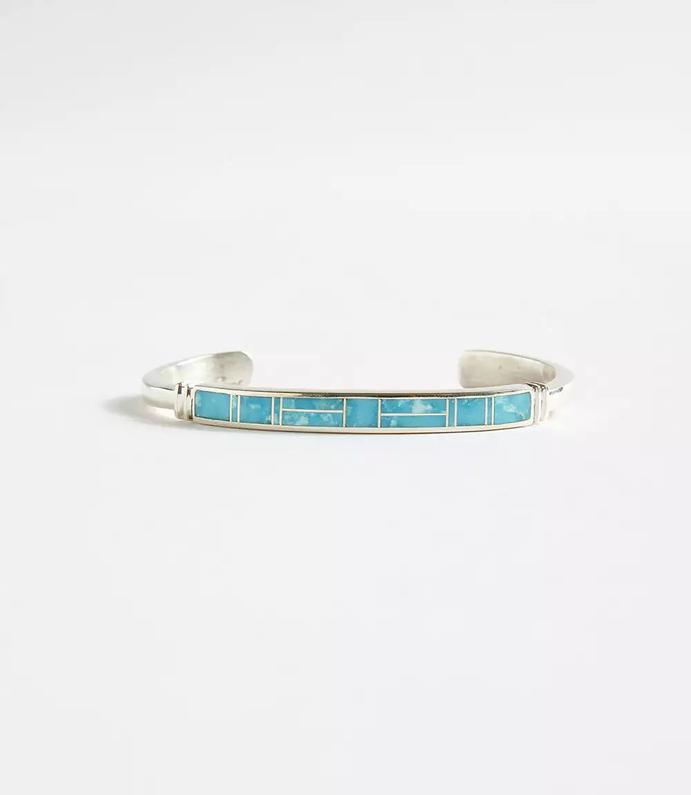 This sterling silver cuff was delicately made by a Navajo artist. It features a stunning geometric pattern crafted from turquoise inlay. Please note this bracelet cannot be adjusted.