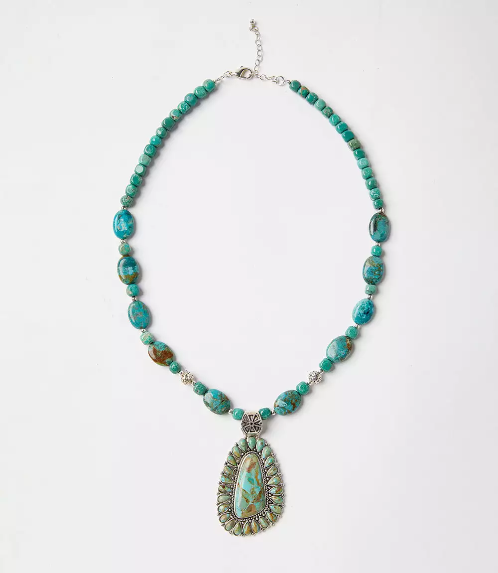 Handcrafted by artisans, this stunning necklace is made of an assortment of earthy-toned turquoise stones. It’s detailed with a turquoise pendant encased in sterling-silver.
