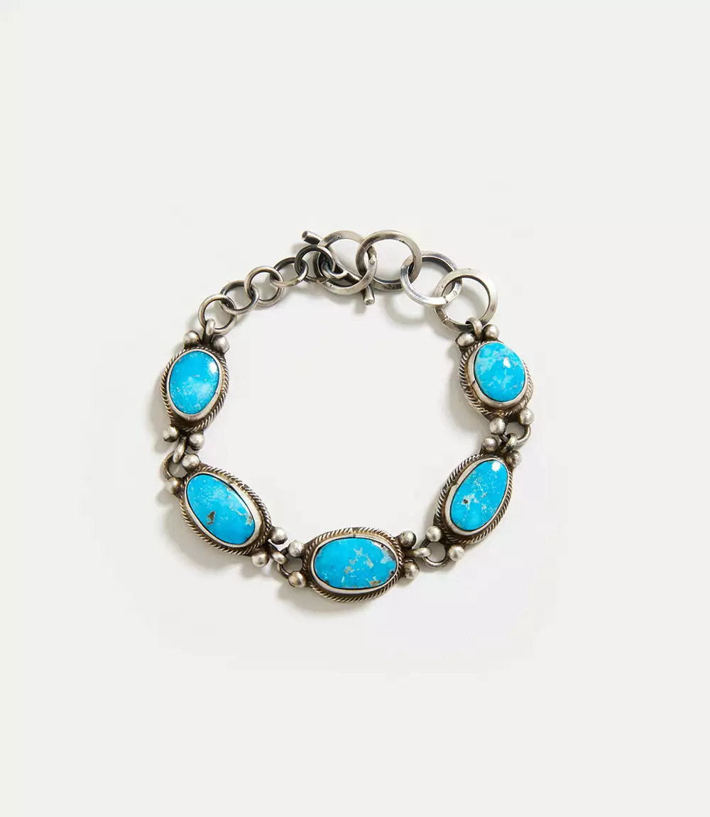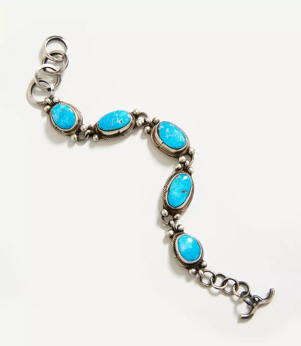 This sterling silver bracelet was delicately made by a Navajo artist. It’s crafted from sterling silver and vibrant turquoise stones.