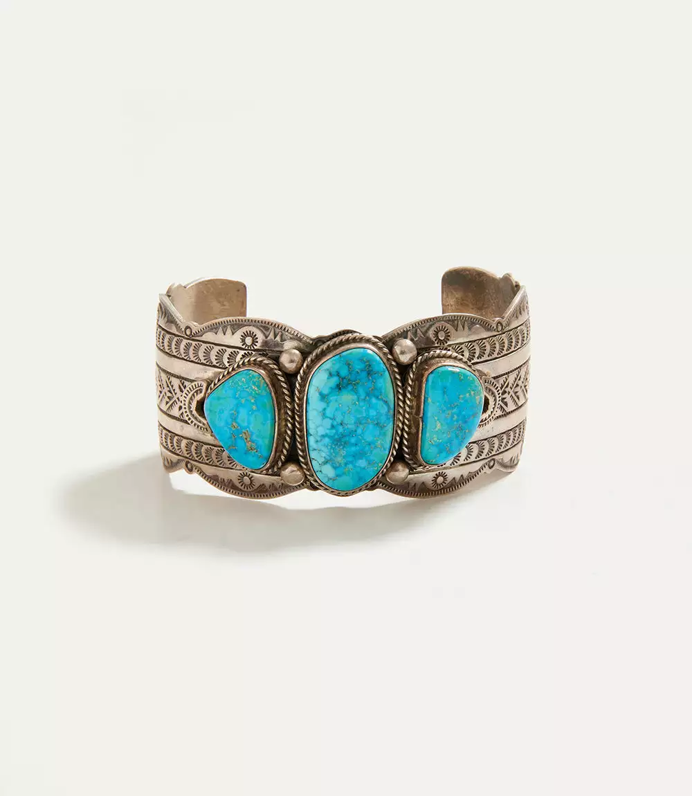 This sterling silver cuff was delicately made by Navajo artist Joe Piaso Jr. Stunning Kingman turquoise stones are encased in this sterling-silver cuff. It’s detailed with exquisite deep stampwork and silver droplets.