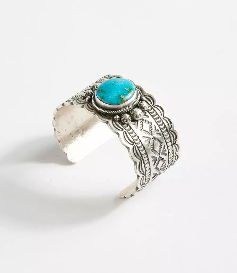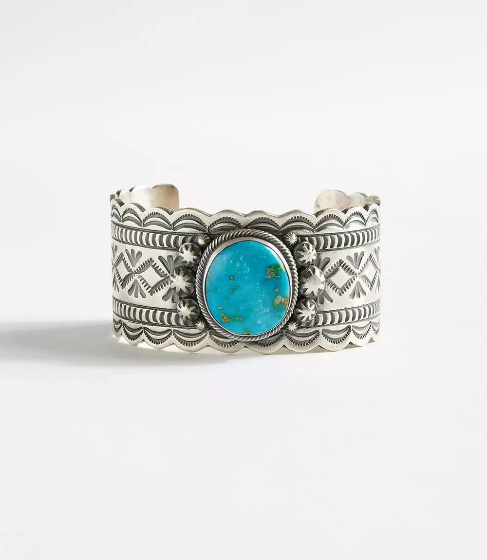 This sterling silver cuff was delicately made by a Navajo artist. A stunning turquoise stone is encased in this sterling-silver cuff. It’s detailed with exquisite deep stampwork and silver droplets.