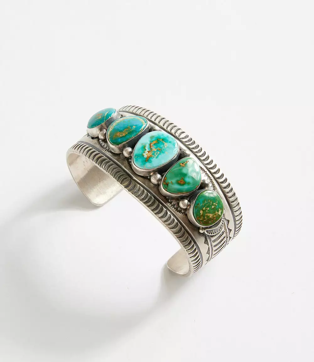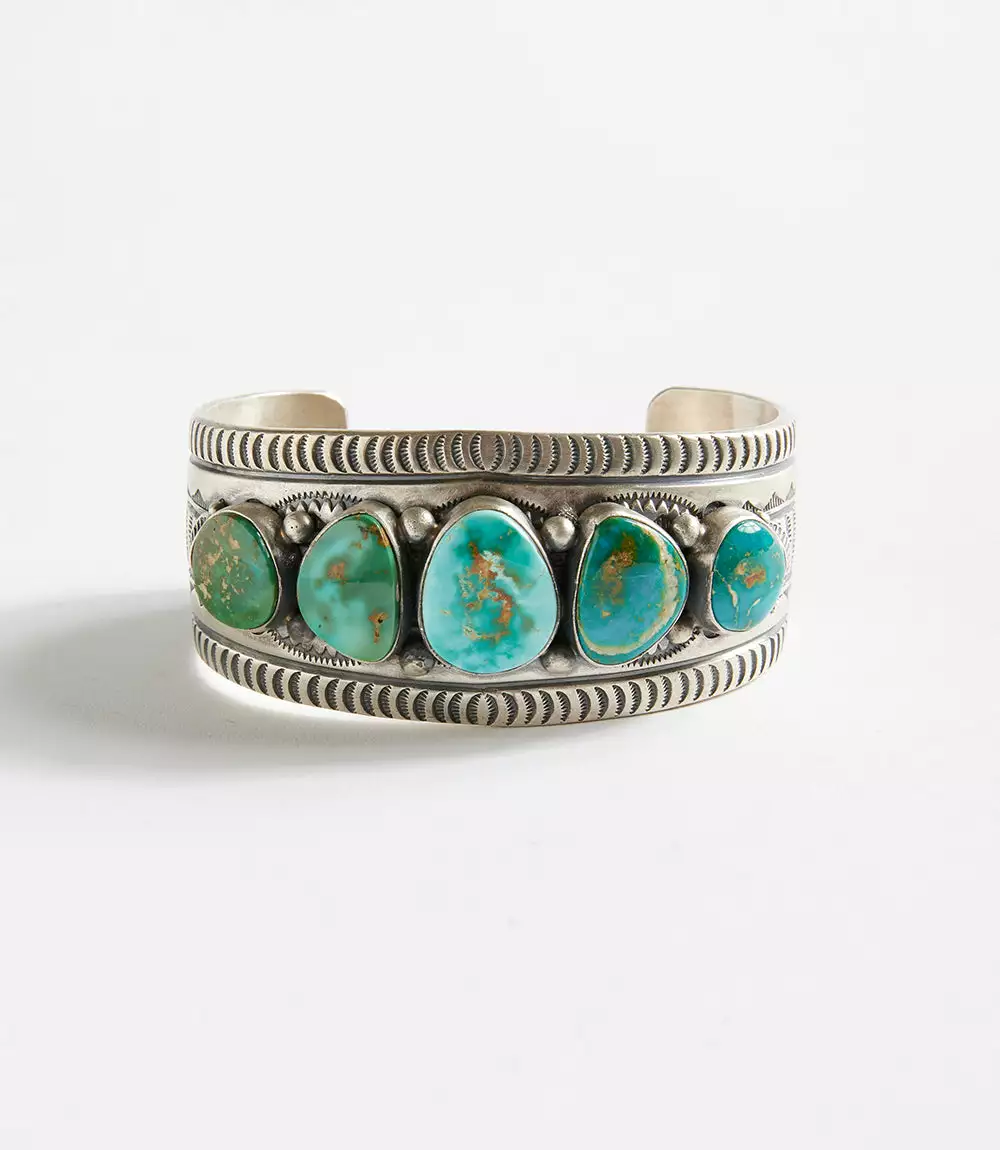 This sterling silver cuff was delicately made by a Navajo artist. Stunning turquoise stones are encased in this sterling-silver cuff. It’s detailed with exquisite deep stampwork and silver droplets.