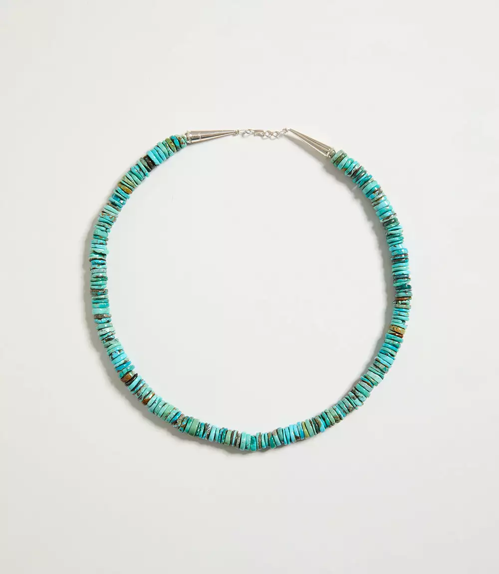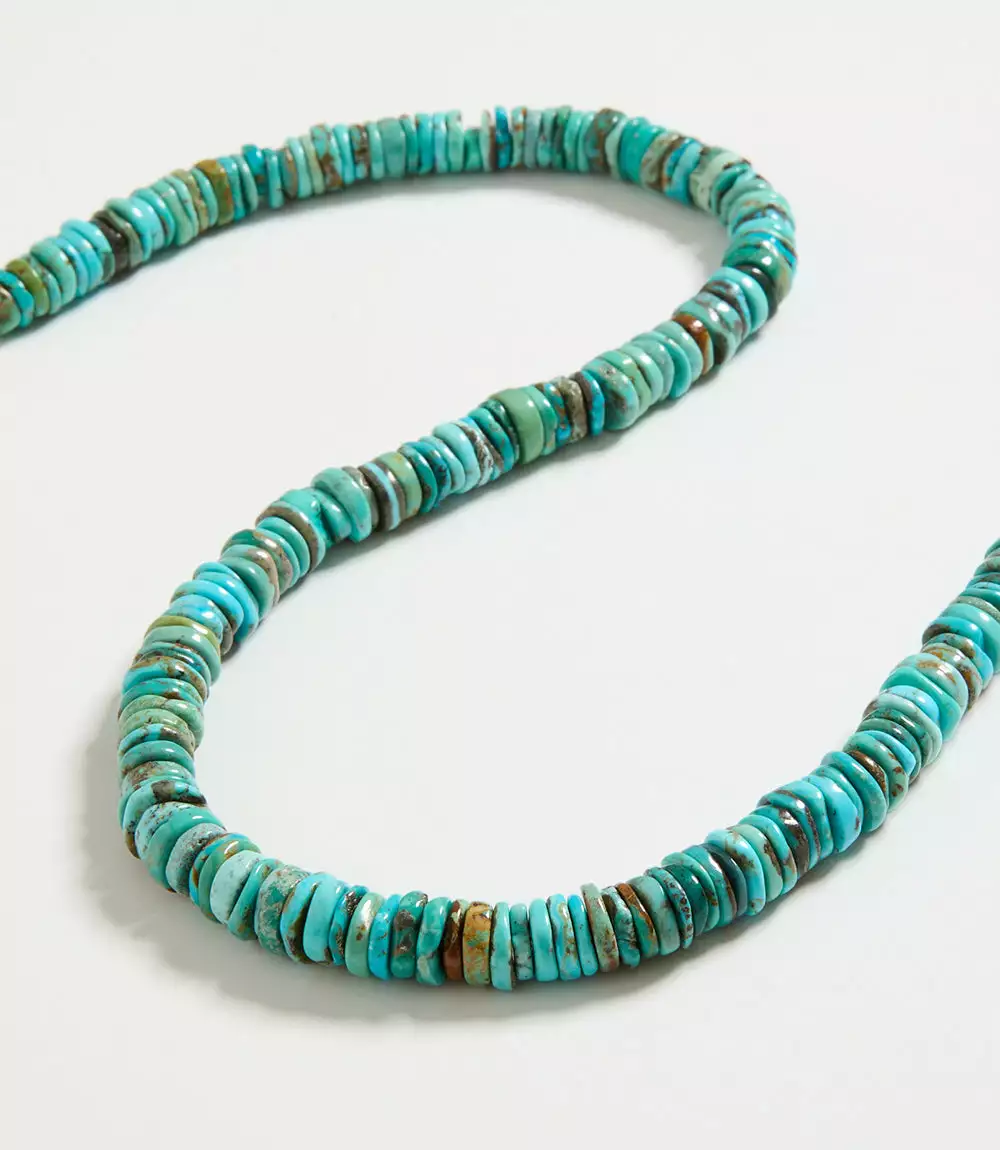 Handcrafted by Native American artisans, this stunning necklace is made of a single strand of turquoise stones and is finished with a sterling silver hook and eye closure.