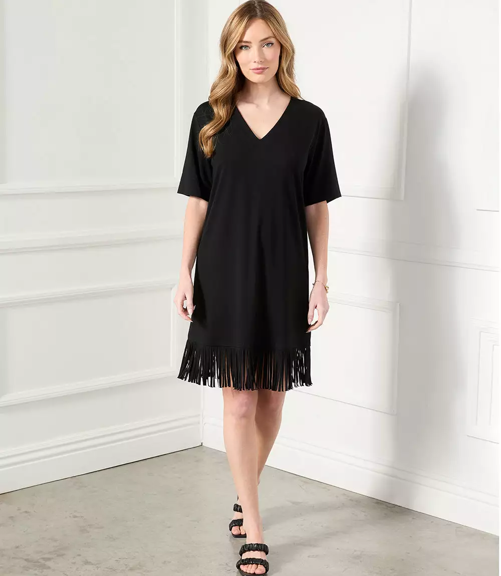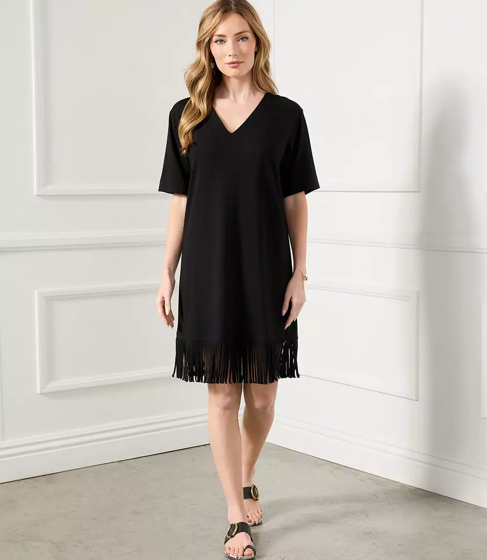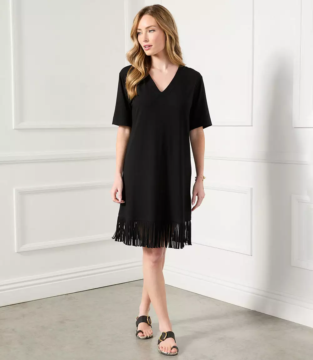 A lush curtain of fringe details the hem of this comfortable dress cut from stretch jersey-knit. This dress can easily transition from brunch to dinner with a simple switch of shoes and accessories.