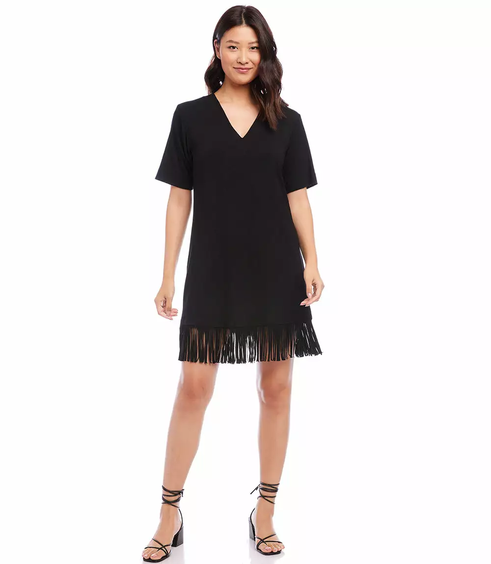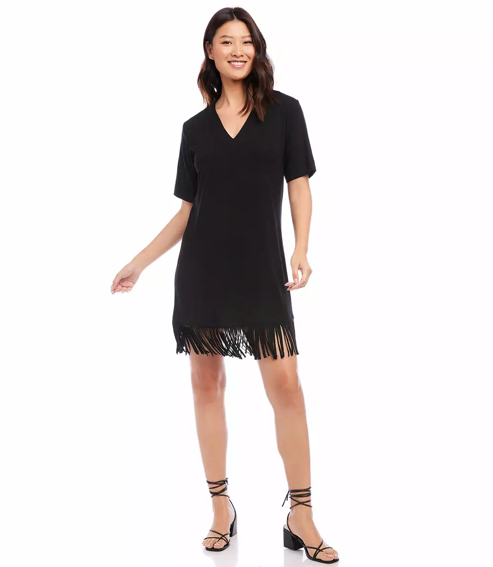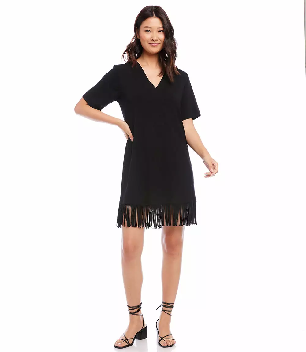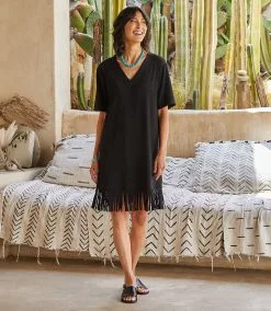 A lush curtain of fringe details the hem of this comfortable dress cut from stretch jersey-knit. This dress can easily transition from brunch to dinner with a simple switch of shoes and accessories.