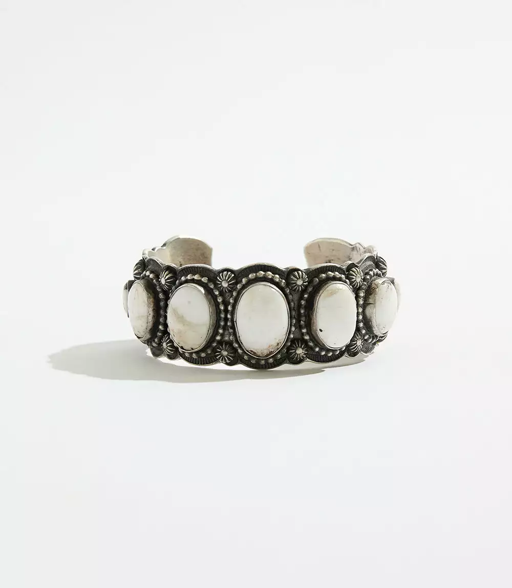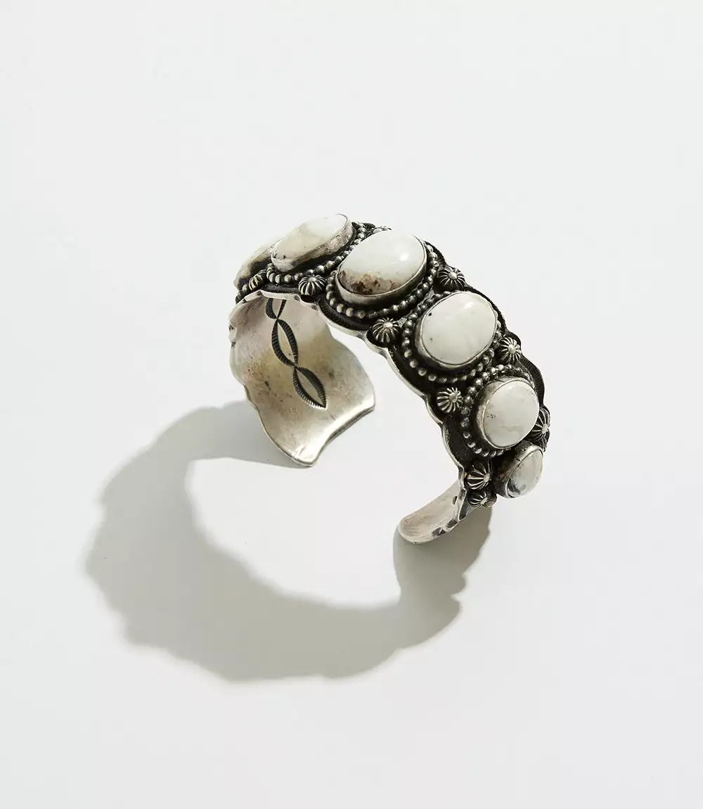 One-of-a-kind White Buffalo stones are encased in a sterling-silver cuff that is detailed with exquisite deep stampwork and silver droplets that decorate the edges.